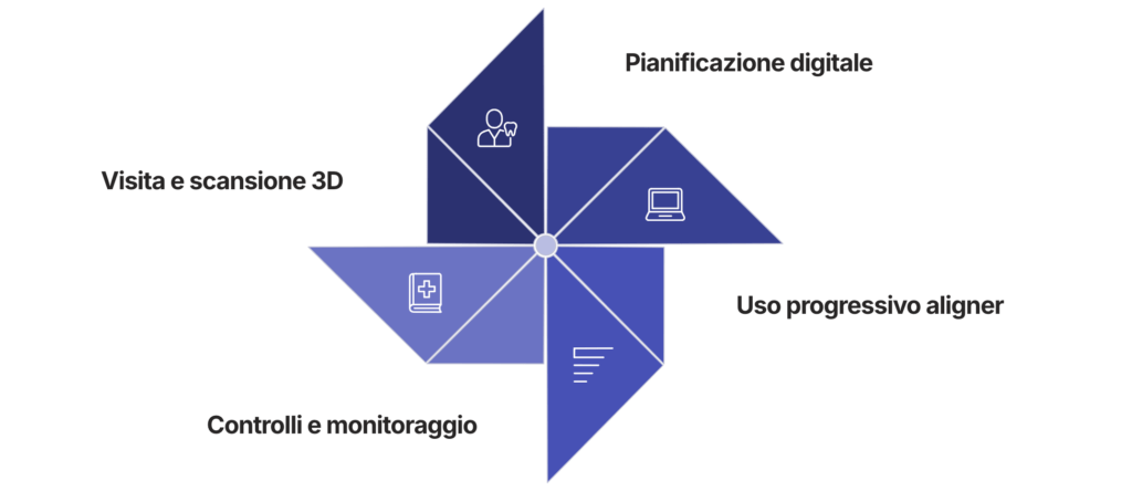 Il percorso ortodontico con allineatori trasparenti si articola in 4 fasi ben definite: dalla prima valutazione fino al completamento del trattamento, ogni step è pianificato con precisione.